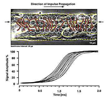 Rohr had another technical hurdle to overcome with A/D conversion. His first system was equipped with two A/D cards that together allowed him to collect data from 80 channels. His goal, however, was to collect data from over 200 photodiodes at once. In addition to limiting the number of channels, the previous cards also limited how much data could be collected in any given session. This is because they moved data back and forth between the PC's RAM and had no way to off-load data to a storage device. When RAM was filled the experiment had to cease. Another drawback to those early A/D boards was that they had to interact with the PC's operating system. This was a problem for Rohr for two reasons. First, when the operating system changed, he had to rewrite his test routine. "I never knew when Microsoft would change the operating system, and when they did it took a lot of time until the system was running properly again," he explains. The other problem was the fact that Windows is not a real-time operating system. Running the A/D conversion under Windows made the system vulnerable to situations where Windows was occupied with other tasks, possibly interrupting the data flow. "Operating systems like Windows use up many cycles on the PC platform, and when they take control of the CPU they hold onto it for a long time in data acquisition terms," says Rohr. "To convert the data in real-time, computing power has to be available whenever it is needed." Bypassing WindowsRohr needed to be able to perform A/D conversion without involving Windows or the PC's CPU. He wanted to be able to add channels as necessary without the need to completely reconfigure his system. And he wanted the ability to transfer the digital data produced by A/D conversion to the PC's hard disk so the experiment could proceed for longer lengths of time. These requirements led him to investigate other options for A/D conversion. His research led him to the DAP board from Microstar Laboratories, Bellevue, Washington, which met his requirements. The unique capability offered by DAPs is an onboard microprocessor that runs a multitasking, real-time operating system optimized for high-performance real-time data acquisition and control applications. The intelligence on the DAP board extends the power of the Windows user interface by executing all processor-intensive routines in real time so that there's never any danger of losing data regardless of how many computer cycles are dedicated to the foreground application or even if Windows crashes. The data acquisition processor continues to run totally independent of the central processor. Rohr configured his system with three DAPs that run in parallel. A small amount of programming was required to send configuration information to the DAPs -- to indicate the sampling rate, for example, and to set up the high-speed channel from the DAP to the PC for acquired data -- and then to transfer the data to the computer's hard disk. The programming was done using Interactive Data Language (IDL) from Research Systems, Boulder, Colorado. IDL programming also controls the experiment and analyzes the data. Rohr's system uses three DAPs simultaneously to support data collection from over 200 channels. The DAP model he chose includes multiple A/D converters, giving the boards the capability of handling the 20 kHz sampling rate from each of the channels -- a combined data rate of over five MHz -- in real time. If Rohr wants to expand the system in the future with more channels, he can do so simply by adding additional DAPs. Reconfiguring the optical recording system with DAPs solved the problems Rohr was having with traditional A/D boards, allowing him to collect data from many more channels and thus to visualize electrical activity in a bigger area of heart cell cultures. It also enables him to record for much longer times than when RAM was the limiting factor. The new optical recording system is helping Rohr gain new insights about how cell structure affects impulse propagation. One of his findings, which he describes as "paradoxical," was published in the journal, Science. In that article, Rohr acknowledged that disturbances in impulse propagation can be caused by structural discontinuities such as "surviving tissue strands connecting islands of intact myocardial tissue in infarct scars." He wrote: "In . . . structural discontinuities, a small current source is connected to a large current load, resulting in a current-to-load mismatch that causes slowing of conduction or conduction block. Both electrical uncoupling and the presence of discontinuous tissue structures are known to be involved in the generation of life-threatening cardiac arrhythmias and it is generally assumed that they act synergistically in the depression of conduction." His findings indicated, however, that "uniform electrical uncoupling occurring in discontinuous tissue structures improves conduction." These sorts of findings would not be possible without the unique optical recording system. The system is proving to be very valuable in studying the causes of sudden cardiac death, the leading killer in Western society. By using DAPs to overcome the limitations of conventional A/D equipment, Rohr was able to design a system capable of handling the large amount of data necessary to get such a close a look at the heart.