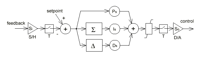 Applying the PID1 Processing CommandThe DAPL implementation of PID in the PID1 command is slightly different from a conventional PID controller. The Data Acquisition Processor is a computing device, so instead of operating directly on voltage signals, it actually operates on digitized samples using fixed-point arithmetic. A detailed block diagram of a DAPL PID controller is provided in Figure 4.