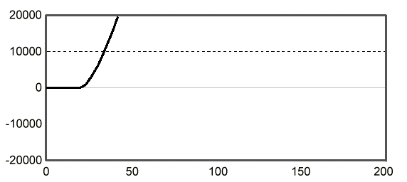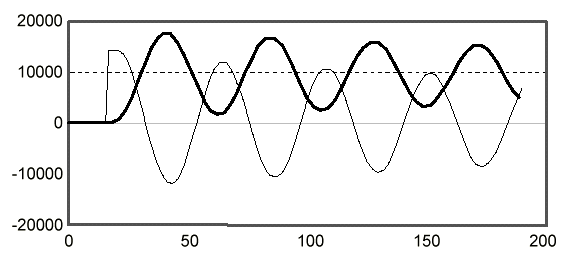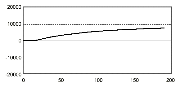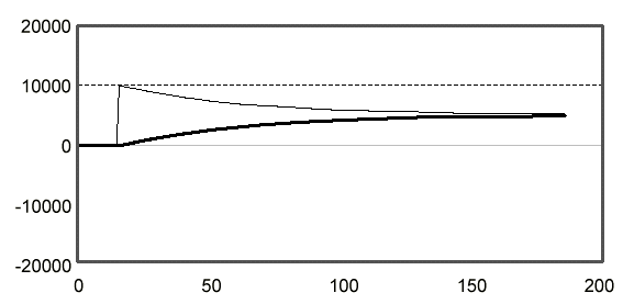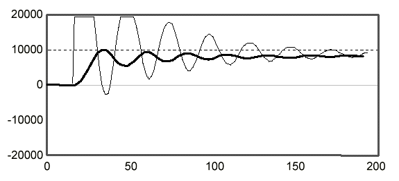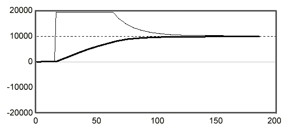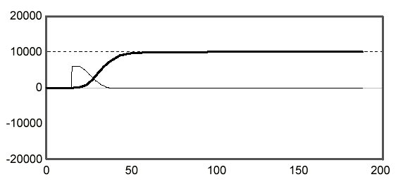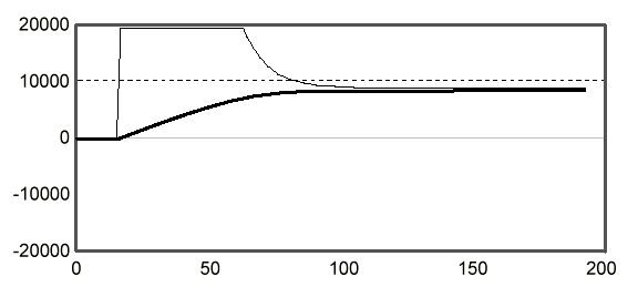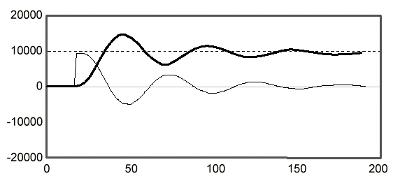 If you examine Figure 7, you will notice that the system still does not reach the setpoint level of 10,000. As the system approaches the setpoint, the control effort drops away. We can correct this problem by introducing some Integral correction. Setting IV=300, we obtain the response curve shown in Figure 8. As long as the system operates below the setpoint, the Integral correction increases until the system reaches the setpoint.