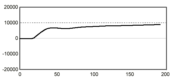 To get the system to the setpoint quickly, the usual strategy is to apply Proportional control. Using the coefficients given at the beginning of this test case, the unity Proportional gain causes the system to overshoot the setpoint of 10,000. The system oscillates for a significant time, as shown in Figure 10.