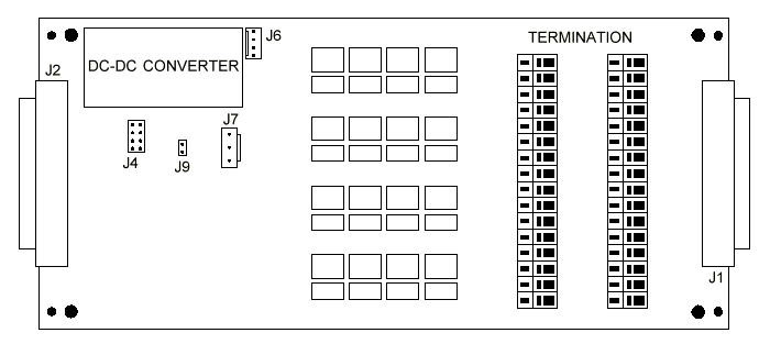More Than One Simultaneous Sampling BoardSeveral Simultaneous Sampling Boards can be connected together to provide simultaneous acquisition of more than 16 inputs. When more than one Simultaneous Sampling Board is used, the J2 connectors of all Simultaneous Sampling Boards are tied together using a daisy-chained cable. Note: External power is required when more than two Simultaneous Sampling Boards are used. Two connectors must be set when using more than two boards: J4 and J9. Each Simultaneous Sampling Board must be configured to recognize a specific input pin range. The range is selected by J4, a header of two rows on .100 inch centers. Connector J4 is located below the DC-to-DC converter and to the right of J2. Jumpers are placed horizontally, connecting like numbers. ![]()