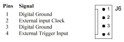 Connector J9 enables the address on J4. J9 is located to the right of J4. The J9 connector on each board should have a jumper installed when several Simultaneous Sampling Boards are used. When J9 does not have a jumper, the Simultaneous Sampling Board is enabled independent of the address provided by the DAP. Note: When a Simultaneous Sampling Board is used with other accessory boards, no boards can use inputs in the S256-S511 range. Also, make sure that all boards use different input pin ranges to avoid addressing conflicts. External Trigger ConnectionAn external trigger signal can be connected to connector J6 to provide hardware triggering. J6 is a header of one row on .100-inch centers. The connector J6 is Molex part number 22-23-2041. J6 is located to the right of the DC-to-DC converter. ![]() External signals connected to J6 must be in the standard TTL range of 0 to +5 volts. The pins on J6 connect directly to the pins on a Data Acquisition Processor. The external trigger input signal and external clock input signal can be connected to pins 67 and 68 of J1 is connector J6 is not in use. External Power ConnectionsOn MSXB 028-02 and -04, connector J7 provides connection for external power for systems with more than two Simultaneous Sampling Boards. Connector J7 is a single row header on .156-inch centers and is located below the DC-to-DC converter. J7 is Molex part number 26-60-4030, which mates with Molex part number 09-50-3031. MSXB 028-02 and -04 each require 1.0 Amp of power. ![]() Note: It is best to power the MSXB 028-02 and -04 from the host PC's power supply so that both the Simultaneous Sampling Board and the DAP are powered on and off at the same time. If this is not practical, then external power to the Simultaneous Sampling Board should be applied before powering on the DAP and should be disconnected after powering off the DAP.