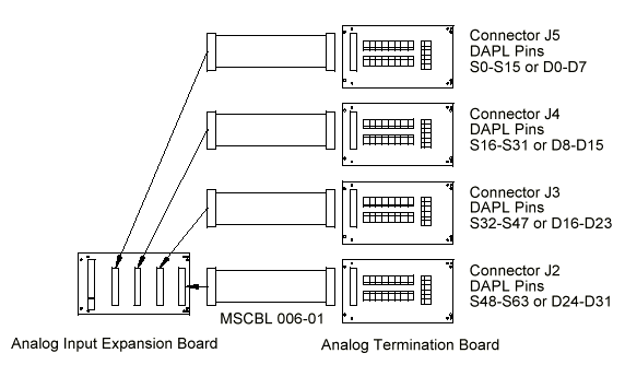 The signal input pins on the MSXB 001, MSXB 002, and MSXB 018 Analog Input Expansion Boards are ordered differently than the pinout of the Data Acquisition Processor analog connector. This can be confusing when using DAPL Beginning with DAP Software version 4.3, and all DAP Software for DAPL 2000, you can use the The diagram below shows the signal connections for one Analog Input Expansion Board with ![]() Each termination board is labeled S0-S15. The inputs on each termination board map sequentially to the DAPL input pins. For example, the termination board connected to J3 has termination input S0 mapping to DAPL input S32, S1 mapping to S33, S2 mapping to S34, etc. See the Analog Input Expansion Boards chapter of the dataacquisition/Accessories Manual for the pin mapping without using