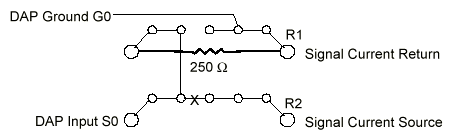 For current input, a current source is connected to the Sx terminal and the ground return is connected to the Gx terminal. To convert voltage input S0 into a current input that generates 1 to 5 volts with an input current of 4 to 20 milliamps, a 250 ohm resistor is inserted in the R1 location. In this case, the maximum power dissipated in the resistor is 0.1 watt at +5 volts; this is the maximum recommended power dissipation. Figure 2 illustrates the connections for this example.