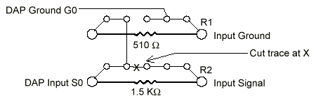 Resistance values of 1500 and 500 Ohms may be used. The trace beneath the X above R2 is cut. Then the 500 Ohm resistor is placed in the R1 position and the 1500 ohm resistor is placed in the R2 position. Since 500 Ohm resistors are not commonly available, a 510 Ohm resistor would typically be used instead, resulting in a small error in the division ratio. This error is linear and can be corrected by multiplying by a constant in DAPL. Figure 4 illustrates the circuit for this example.