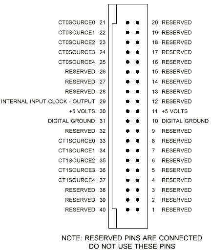 The Microstar Laboratories Counter/Timer Board, part number MSXB 036, provides high-speed counting and timing functions to a Data Acquisition Processor. The Counter/Timer Board has 10 high-speed counters, each of which has 16-bits of resolution. Eight of the counters have maximum input frequencies of 6.8 MHz, while two have prescalers that allow input frequencies up to 100 MHz. The Counter/Timer Board includes a digital expansion port. Hardware ConfigurationThe Counter/Timer Board may be connected to a Data Acquisition Processor with a 100-line cable adapter board, part number MSCBL 046-01 and a 100-line cable, part number MSCBL 054-01 or part number MSCBL 056-01. The MSCBL 046-01 attaches to the Digital Input/Output Port of the Data Acquisition Processor. The MSCBL 054-01 or MSCBL 056-01 connects the cable adapter board to connector J1 of the Counter/Timer Board. The Counter/Timer Board may also be connected directly to the Digital Input/Output Port of the Data Acquisition Processor with a 100-line adapter ribbon cable, part number MSCBL 058-01. Warning: Never connect or disconnect the Counter/Timer Board while the Data Acquisition Processor is powered. The Counter/Timer Board provides ten independent counter inputs. TTL input signals may be applied between a counter input pin and ground on connector J3 of the Counter/Timer Board. Connections should be made only to pins labeled The Counter/Timer Board has two socketed termination resistor networks, RN9 and RN10, adjacent to J1. The resistors are installed in the sockets when the boards are shipped from the factory. For single-board systems the resistors should remain installed. For multiple-board systems, only one board may have the resistors installed. The board farthest from the Data Acquisition Processor should have the resistors installed in it. If more than one board in a system has the resistors installed, the system may fail. The Counter/Timer Board reserves digital input ports zero and one and reserves digital output ports zero through seven. Other digital expansion boards must be configured for other port addresses when used with a Counter/Timer Board. Connector J3 is a 40-line cable connector for counter inputs. The pin numbering of connector J3 is: