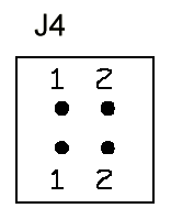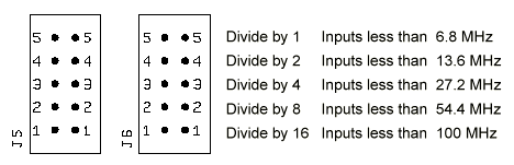 Warning: If a voltage greater than 5 V or less than 0 V is applied to an input, damage to the Counter/Timer Board may occur. Signals must not be applied to the Counter/Timer Board when power to the Counter/Timer Board is off or damage to the Counter/Timer Board may occur. The minimum low period of a counter/timer input signal is 70 nanoseconds and the minimum high period is 70 nanoseconds. The maximum frequency for an input signal is 6.8 MHz. Counter inputs 0 and 1 are connected to prescalers. Each prescaler is a circuit that divides its input frequency by 1, 2, 4, 8, or 16. The divisor is selected by means of a jumper. Header J5 selects the divisor for input 0 and J6 selects the divisor for input 1. The diagram below shows the jumper positions for the various divisors. The diagram is oriented such that pin 1 is closest to the bottom edge of the circuit board.