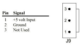 External PowerThe Counter/Timer Board allows an external 5-volt power supply to be connected through connector J9. Connector J9 is a male Molex connector part number 26-60-4030 and mates with Molex connector part number 09-50-3031. The Counter/Timer Board typically requires 1.2 Amp at +5 Volts DC.