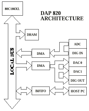 The 80C186XL processor, shown in Figure 1, performs the operations necessary for data acquisition and control. The CPU resides on the local DAP 820 bus and directs all data transfers. For instance, data from the analog and digital inputs are sent via DMA transfers to the onboard DRAM memory. From there data can be processed by the CPU, transferred to the PC, and/or directed via DMA to the output section. Transfer of data and other communication to the PC is handled by a BiFIFO buffer. Information can be exchanged with the PC in both directions simultaneously and can be either DAPL programs, binary or text data, error messages, or DAPL system commands. This communication method is not only faster than DMA, but allows multiple Data Acquisition Processors to share one interrupt line. In this way, up to 14 Data Acquisition Processors can control and acquire data in one PC. In addition to the processor and data transfer hardware, some important hardware specifications of the DAP 820 are given in Table 2.