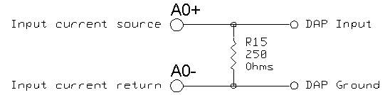 For current input, a current source is connected to the Ax+ terminal and the ground return is connected to the Ax- terminal. To convert voltage input A0 into a current input that generates 1 to 5 volts with an input current of 4 to 20 milliamps, a 250 ohm resistor is inserted in the R15 location. In this case, the maximum power dissipated in the resistor is 0.1 watt at +5 volts; this is the maximum recommended power dissipation. Figure 1 illustrates the connections for this example.