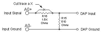 Resistance values of 1500 and 500 ohms may be used. The trace beneath the X above R16 is cut. Then the 500 ohm resistor is placed in the R15 position and the 1500 ohm resistor is placed in the R16 position. Since 500 ohm resistors are not commonly available, a 510 ohm resistor would typically be used instead, resulting in a small error in the division ratio. This error is linear and can be corrected by multiplying by a constant in DAPL. Figure 2 illustrates the circuit for this example.