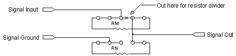 Once this trace is cut, the resistors for the voltage divider are soldered into place. The resistor on the ground side of the divider is placed in an odd numbered resistor location and the resistor on the input signal side of the divider is placed in an even numbered resistor location. Figure 2 and Table 1 illustrate resistor placement for each input.