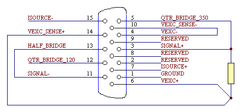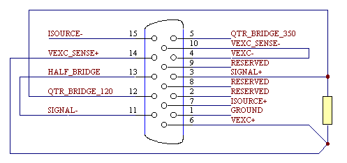 The MSXB 046 interface board must be installed into the slot J1 of the MSXB 047 backplane. The MSXB 046 provides the interface to the iDSC 1816 as well as power for the MSXB 047 and MSXB 044 boards. J2 of the MSXB 046 is connected to the iDSC 1816 using a MSCBL048 or MSCBL050. When installing a board into the backplane, push the board firmly into the slot and make sure the board is securely connected to the backplane. Next, secure the front panel of the board to the enclosure with the two screws. Warning: Never install a board into the backplane or remove a board from the backplane while the backplane is powered. The MSXB 046 is powered externally via an 8-line mini-DIN connector, J3, on the front panel of the board. The MSXB 046 can be connected to a standard PC power supply by using both an MSCBL080-01 and an MSCBL081-02. The MSCBL081-02 installs inside the PC and is used to bring power out from the PC power supply to an 8-line mini-DIN panel mount connector on the back of the PC. The MSCBL080-01 is used to connect the MSXB 046 to the 8-line mini-DIN power connector on the back of the PC. The MSXB 046 typically requires 2.33 Amps at +12 Volts DC. The user should check and make sure that the total current drawn from the PC power supply does not exceed its limits. Hardware ConfigurationThe following diagram shows the layout of the Signal Conditioning Board: ![]() Figure 1. MSXB 044 The input signals come into the board through connectors J2 and J3. Connectors J2 and J3 are High Density DB-15 connectors which are located on the left side of the board in Figure 1 above. Each connector brings signals for one input channel into the board. J2 corresponds to the even channel and J3 corresponds to the odd channel on the iDSC 1816. The pin diagram for each connector is shown in Figure 2 below. ![]() Figure 2. Input Connector Pin Diagram Pin 1 is the signal ground. Pin 2, pin 8 and pin 9 are reserved, and should not be connected. Pin 3 (SIGNAL+) and pin 11 (SIGNAL-) are the voltage differential inputs. Pin 7 (ISOURCE+) and pin 15 (ISOURCE-) are the current excitation source and its ground return. The current source is used for ICP accelerometers as shown in Figure 3 below: ![]() Figure 3. ICP accelerometer input Pin 6 (VEXC+) and pin 4 (VEXC-) are the voltage excitation source and its ground return. Pin 14 (VEXC_SENSE+) and pin 10 (VEXC_SENSE-) are the voltage excitation sense inputs. VEXC_SENSE+ should be connected to VEXC+ at the sensor. Also, VEXC_SENSE- should be connected to VEXC- at the sensor. The voltage excitation source is used for strain gauges as shown in Figure 4 below: ![]() Figure 4. Strain gauge input Pin 13 (HALF_BRIDGE) is used for half bridge completion as shown in Figure 5 below: ![]() Figure 5. Half bridge completion Pin 5 (QTR_BRIDGE_350) is the quarter bridge completion for a 350 Ohm quarter bridge strain gauge as shown in Figure 6 below: ![]() Figure 6. 350 Ohm quarter bridge completion Pin 12 (QTR_BRIDGE_120) is the quarter bridge completion for 120 Ohm quarter bridge strain gauge as shown in Figure 7 below: ![]() Figure 7. 120 Ohm quarter bridge completion View other Technical Notes. |
