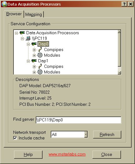 The first step is to install DAPcell client on the PC from which you will be running DASYLab. The PC should be on the same network as the host PC of the DAP board. To check communication with the DAP after installing DAPcell client, go to Control Panel > Data Acquisition Processors. The Browser should automatically search for any DAP boards installed with DAPcell Network Server on the network. In the screenshot shown below, it detected a PC119 with two DAP boards installed.
