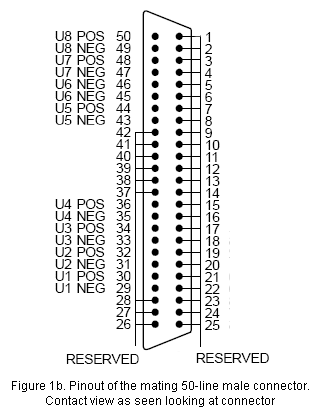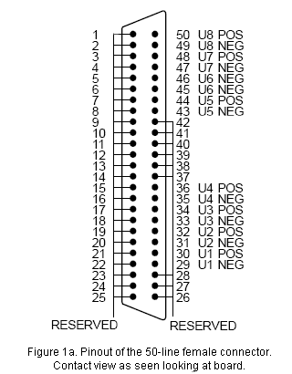 Female (receptable, socket) 50-line connectors are used primarily for digital I/O on some digital expansion boards. They are D-shaped connectors with a double row of pins on 0.050-inch centers. They mate with male (plug) 50-line connectors on connecting cables.